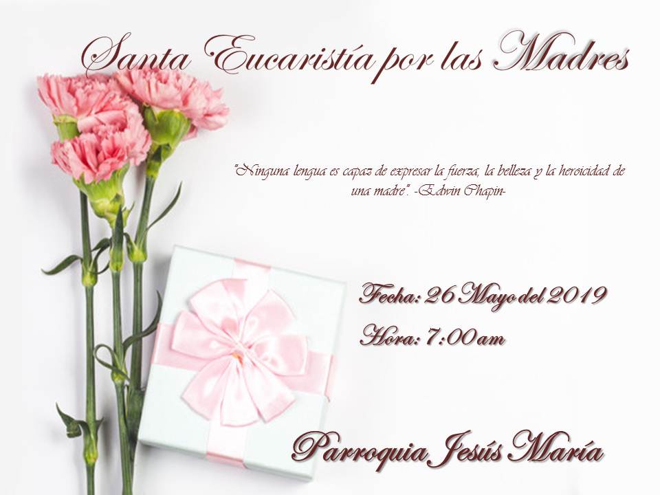 La Parroquia Jesús María en este mes Mariano, tiene el gusto de celebrar el día de las Madres, por ende los equipos parroquiales en compañía de nuestro Sacerdote Marcos Fidel Suárez han diseñado la programación para este domingo 26 de Mayo en la Eucaristía de 7:00 am, contaremos con la Celebración Eucarística y terminado el encuentro eucarístico, tendremos: detalles, serenata, compartir y rifas.