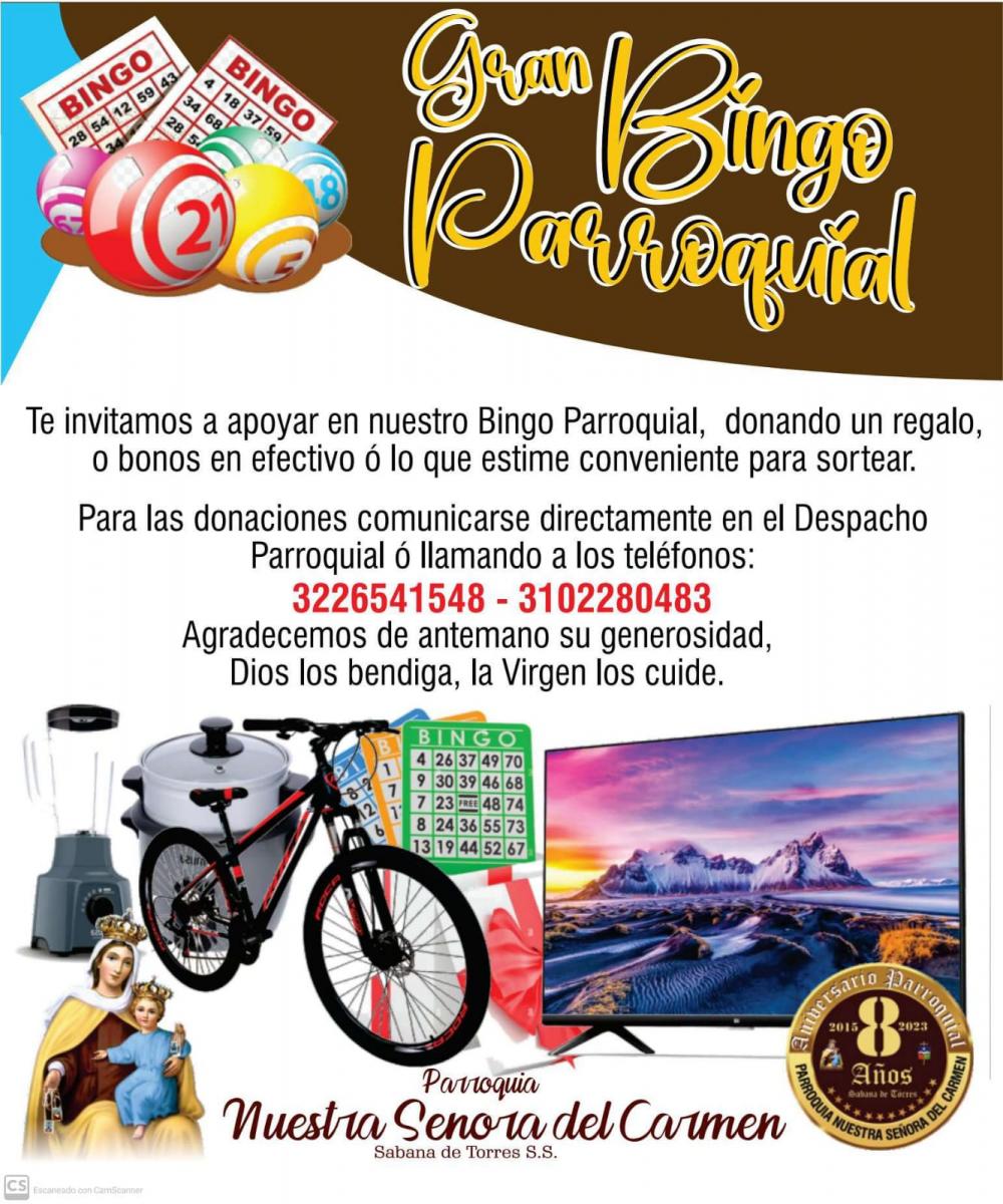 La Comunidad Parroquial Nuestra Señora del Carmen, invita a toda la comunidad a participar del Gran Bingo Parroquial, este 27 de agosto a partir de las 10:00 de la mañana. Agradecemos a todos su ayuda espiritual y material. Bendiciones.