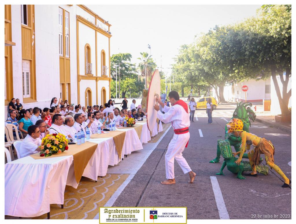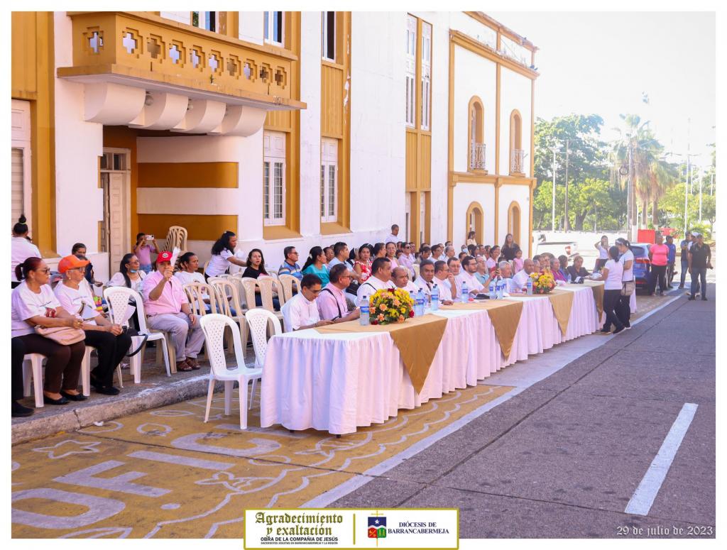 En el exterior de la parroquia Sagrado Corazón de Jesús, la mesa principal, en la que se encontraban el Alcalde Distrital (Alfonso Eljach), el Obispo de Barrancabermeja (Mons. Ovidio Giraldo Velásquez), el Obispo de Magangué (Mons. Ariel Lascarro), y los Padres Jesuitas, entre otras personalidades, disfrutaron de la presentación cultural y protocolaria que se realizó para reconocer y decir gracias a la Compañia de Jesús por el trabajo arduo que realizaron en Barrancabermeja y la región del Magdalena Medio.