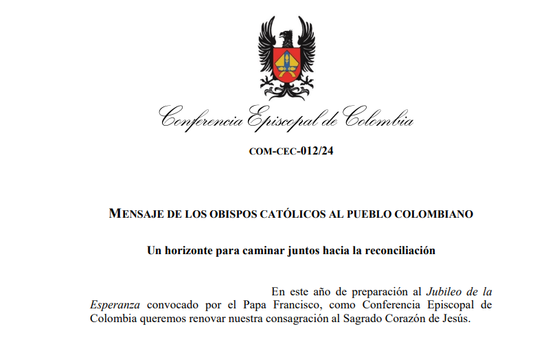En este año de preparación al Jubileo de la Esperanza convocado por el Papa Francisco, la Conferencia Episcopal de Colombia quiere renovar nuestra consagración al Sagrado Corazón de Jesús. Se hace un llamado a todo el pueblo colombiano para que nos esforcemos por promover un horizonte para caminar juntos hacia la reconciliación, pues hoy vivimos tiempos que propician el endurecimiento de nuestros corazones, que nos impiden escuchar, caminar con otros y recordar que todos estamos en la misma barca.
