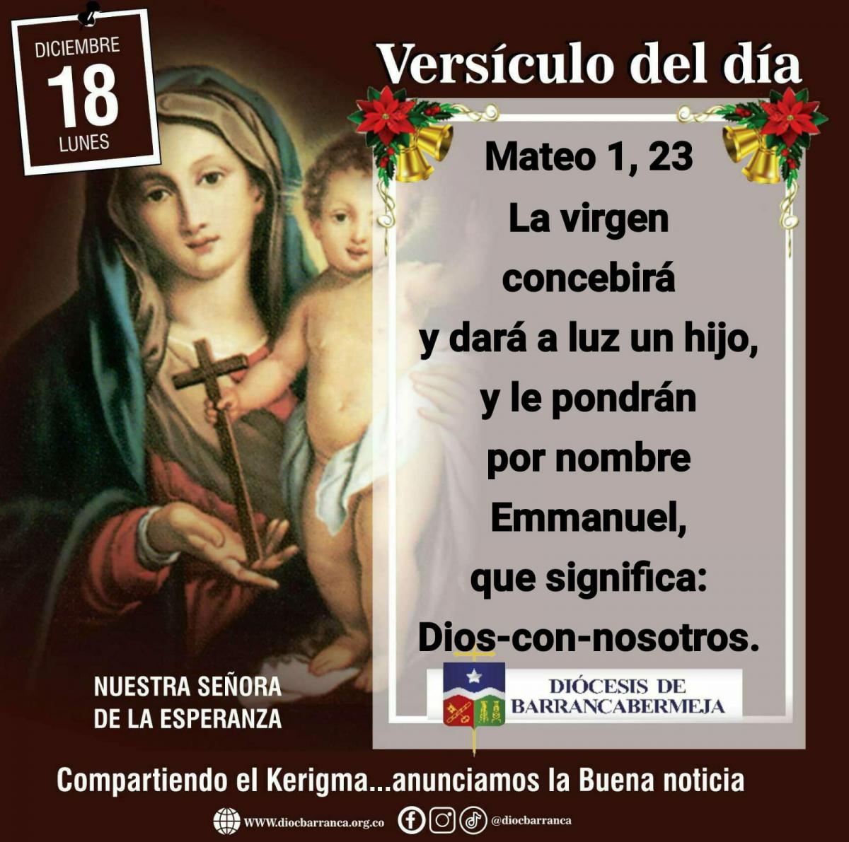 La generación de Jesucristo fue de esta manera: María, su madre, estaba desposada con José y, antes de vivir juntos, resultó que ella esperaba un hijo por obra del Espíritu Santo. José, su esposo, que era justo y no quería denunciarla, decidió repudiarla en privado. Pero, apenas había tomado esta resolución, se le apareció en sueños un ángel del Señor que le dijo: “José, hijo de David, no temas acoger a María, tu mujer, porque la criatura que hay en ella viene del Espíritu Santo. Dará a luz un hijo, y tú le pondrás por nombre Jesús, porque Él salvará a su pueblo de sus pecados”. Todo esto sucedió para que se cumpliese lo que había dicho el Señor por medio del profeta: “Miren: la virgen concebirá y dará a luz un hijo y le pondrán por nombre Enmanuel”, que significa “Dios-con-nosotros”. Cuando José se despertó, hizo lo que le había mandado el ángel del Señor y acogió a su mujer.